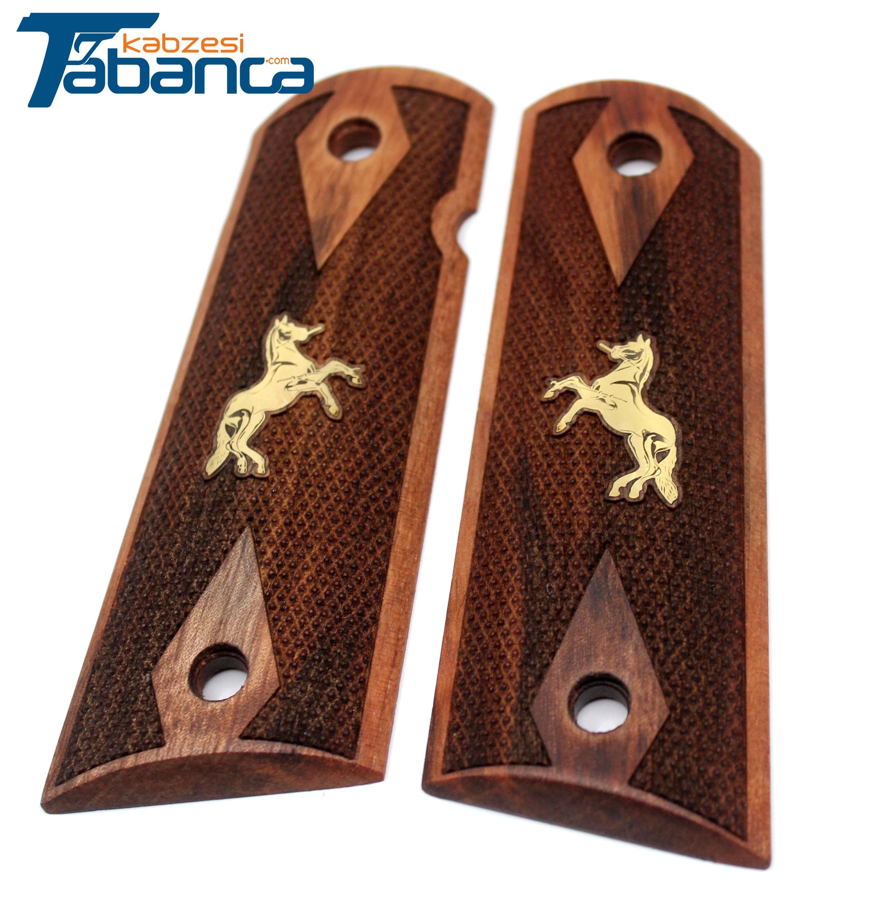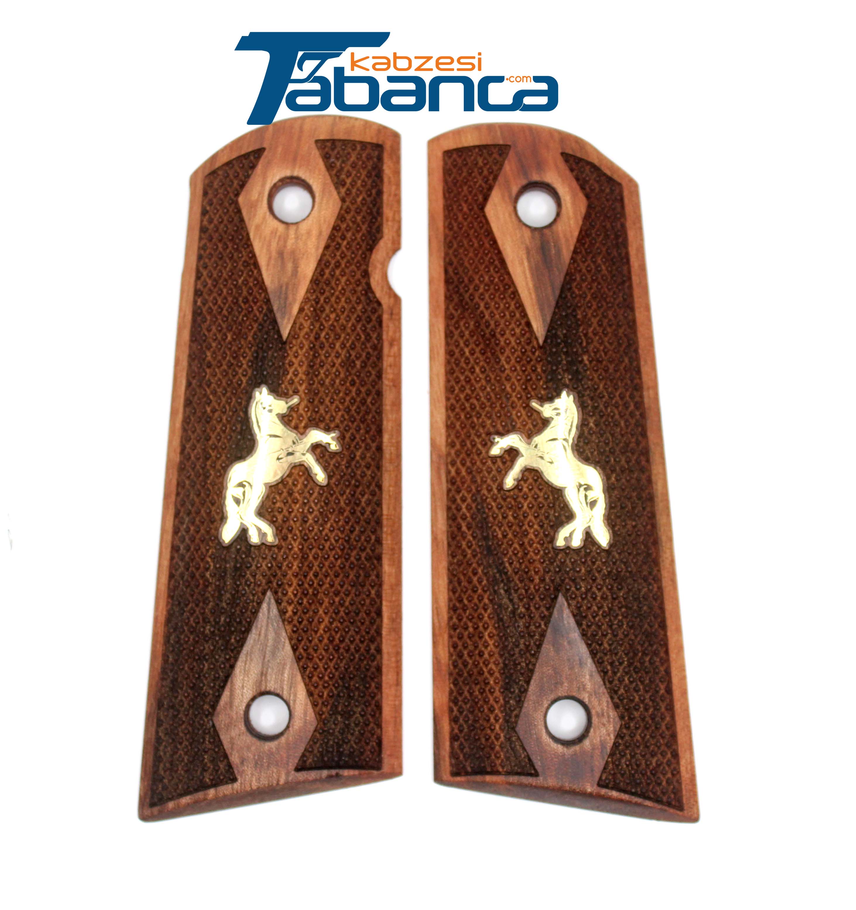 Colt 1911 Uyumlu Ceviz Ağacı Kabze - Sarı Pirinç At Logolu